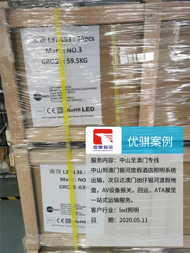 自從我們中山優(yōu)騏物流開通了中山至澳門的物流專線以后,很多原來物流的同行都介紹業(yè)務過來。這個客戶是從中山發(fā)燈具到澳門,整個AV設備報關,回運,ATA展覽都是我們完成,獲得了客戶的一致好評,期待下一次的合作。