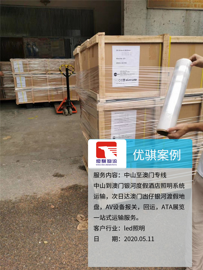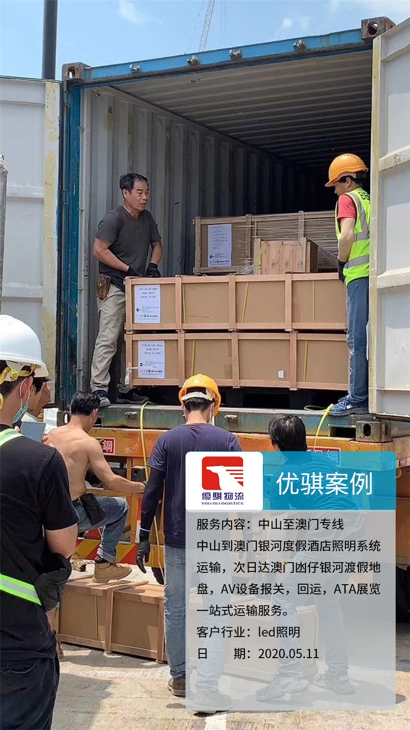 業(yè)務內容:中山到澳門銀河度假酒店照明系統(tǒng)運輸,次日達澳門凼仔銀河渡假地盤,AV設備報關,回運,ATA展覽一站式運輸服務。客戶行業(yè):LED照明客戶來源:老客戶介紹自從我們中山優(yōu)騏物流開通了中山至澳門的物流專線以后,很多原來物流的同行都介紹業(yè)務過來。這個客戶是從中山發(fā)燈具到澳門,整個AV設備報關,回運,ATA展覽都是我們完成,獲得了客戶的一致好評,期待下一次的合作。